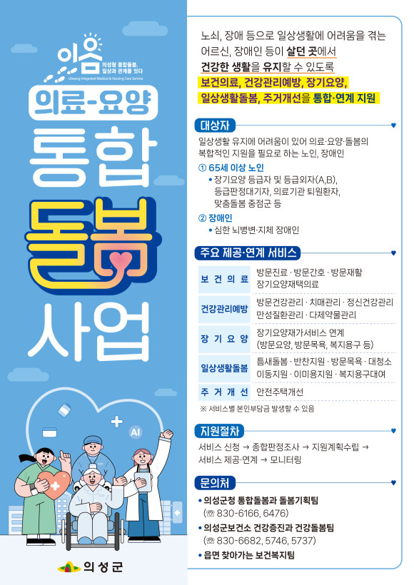 의성군은 지역 어르신들이 시설이 아닌 익숙한 삶의 터전에서 필요한 돌봄을 받을 수 있도록 ‘의성군 의료·요양 통합돌봄 이음’ 서비스 체계를 2026년 본사업 시행에 맞춰 전면 개편·강화하고 있다고 밝혔다. 군은 2023년 7월 시범사업 참여 이후, 2025년 1월 전담부서인 ‘통합돌봄과’를 신설하고 보건진료소 관할 구역을 확대하는 등 제도적 기반을 지속적으로 구축해 왔다. 2026년 통합돌봄 사업 예산은 8억8000만원으로, 시범운영 기간 반찬지원 등 일부 서비스에 편중됐던 구조를 개선해 틈새돌봄과 위생․이동지원 분야를 확대함으로써 서비스 균형성과 실효성을 높였다. 또한, 통합돌봄 대상자를 기존 65세 이상 어르신에서 65세 미만 뇌병변·지체 심한장애인까지 확대하고, 사전조사 결과에 따라 중증은 ‘통합판정조사군’, 경증은 ‘지자체조사군’으로 구분하는 이원화 조사 체계를 도입해 돌봄 사각지대 해소에 나섰다. 아울러 통합지원회의를 월 2회 대면 정례화하고 사전심의 병행 및 읍면 담당자 참여 의무화를 통해 맞춤형 서비스 연계를 강화하고 있다. 소득수준에 따른 5단계 본인부담금 체계를 운영하고, 반찬지원 등 6개 서비스는 중위소득 160% 초과 시 전액 자부담을 적용해 재정 효율성도 높였다. 일상돌봄 분야에서는 반찬지원과 주택개선 서비스 편중 구조를 개선하고 돌봄 기능을 강화하기 위해 틈새돌봄 제공 횟수를 월 36회에서 48회로 확대하고 자격 기준도 완화했다. 특히 수요가 높은 안전주택개선 사업은 읍·면 단위 민간돌봄조직인 ‘행복기동대’와 연계해 대기시간을 단축하고 신속한 지원이 가능하도록 했다. 의료돌봄 분야에서는 공중보건의 감소에 대응해 보건진료 경력직 3명을 채용하고, 삼성연합의원(안계면)과 협력해 장기요양 재택의료센터를 운영한다. 또한 방문진료 기관을 기존 4개소에서 6개소로 확대해 중증 대상자 관리를 강화했다. 이와 함께 군은, 통합돌봄 사업의 인지도 제고와 주민참여 확대를 위해 활동 영상 제작, 현수막 게시, 배너 및 포스터 배부 등 온․오프라인을 아우르는 다양한 홍보 활동을 추진하고 있다.김금주 기자